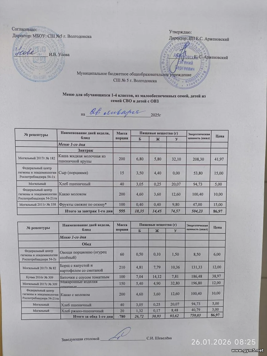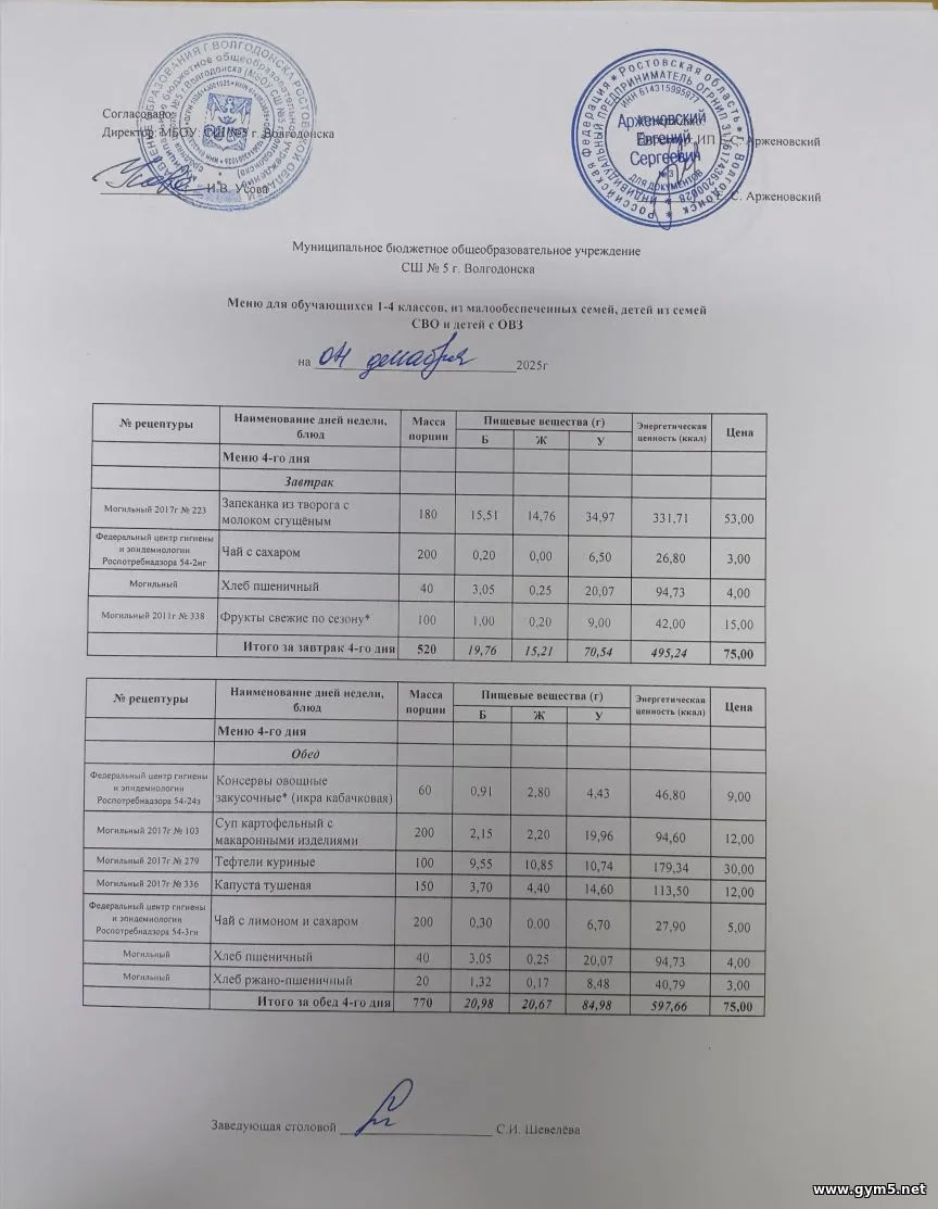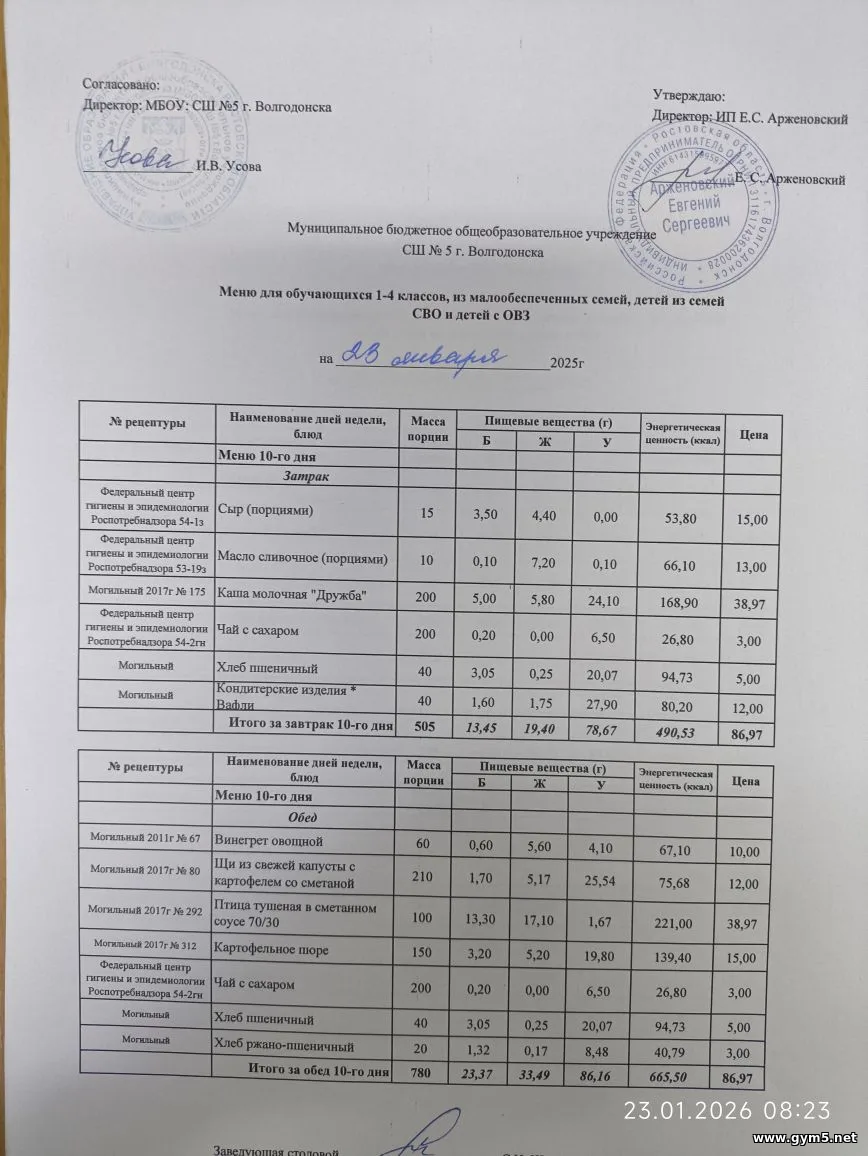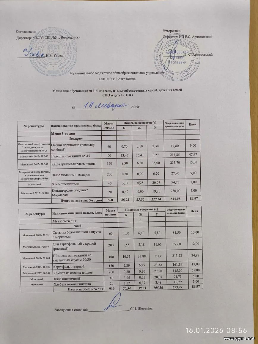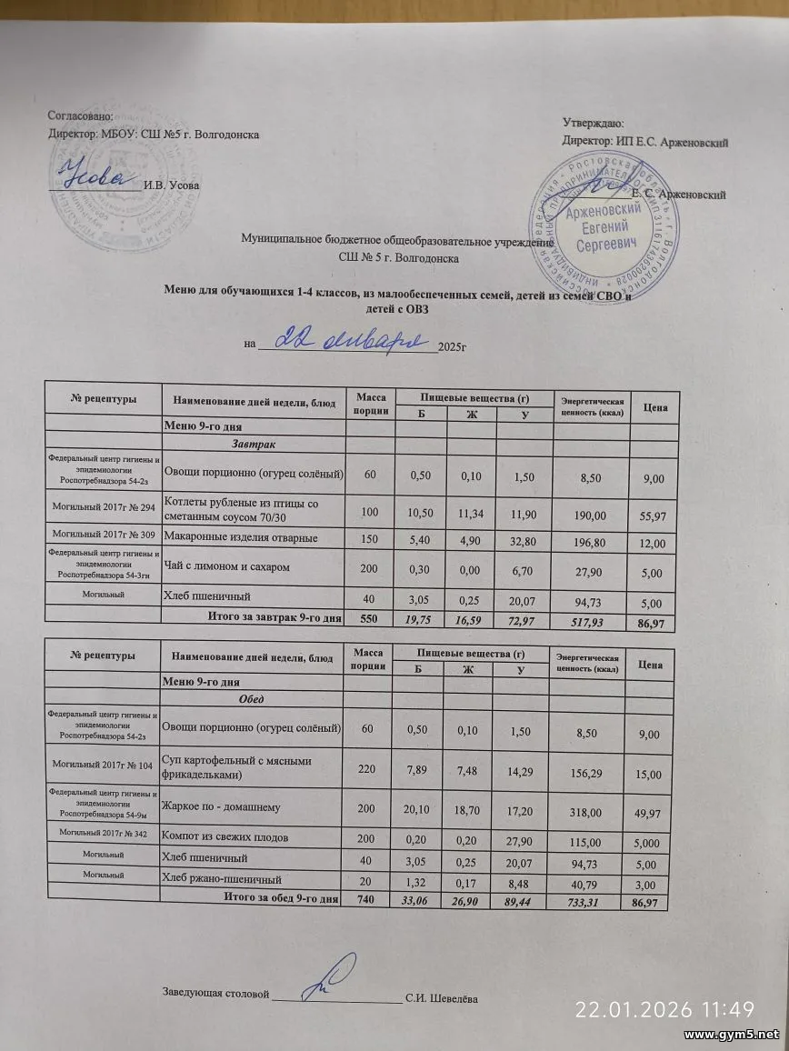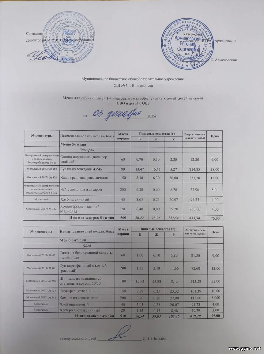 Организатором питания в МБОУ СШ №5 г.Волгодонска является ИП Арженовский Е.С.