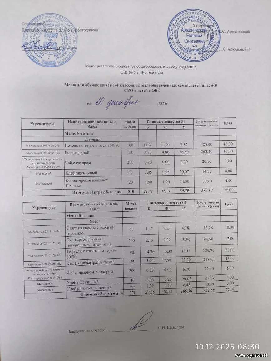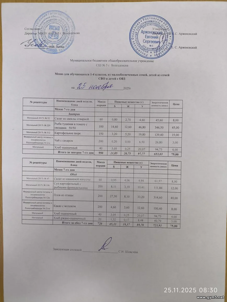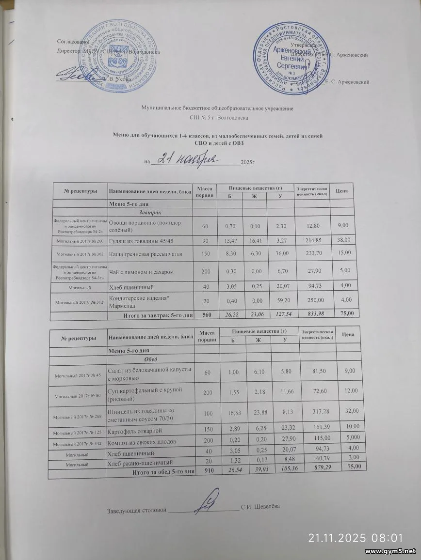 20.11.2025 в МБОУ СШ №5 г.Волгодонска прошел родительский контроль по проверке качества и безопасности питания по соблюдению СанПиН