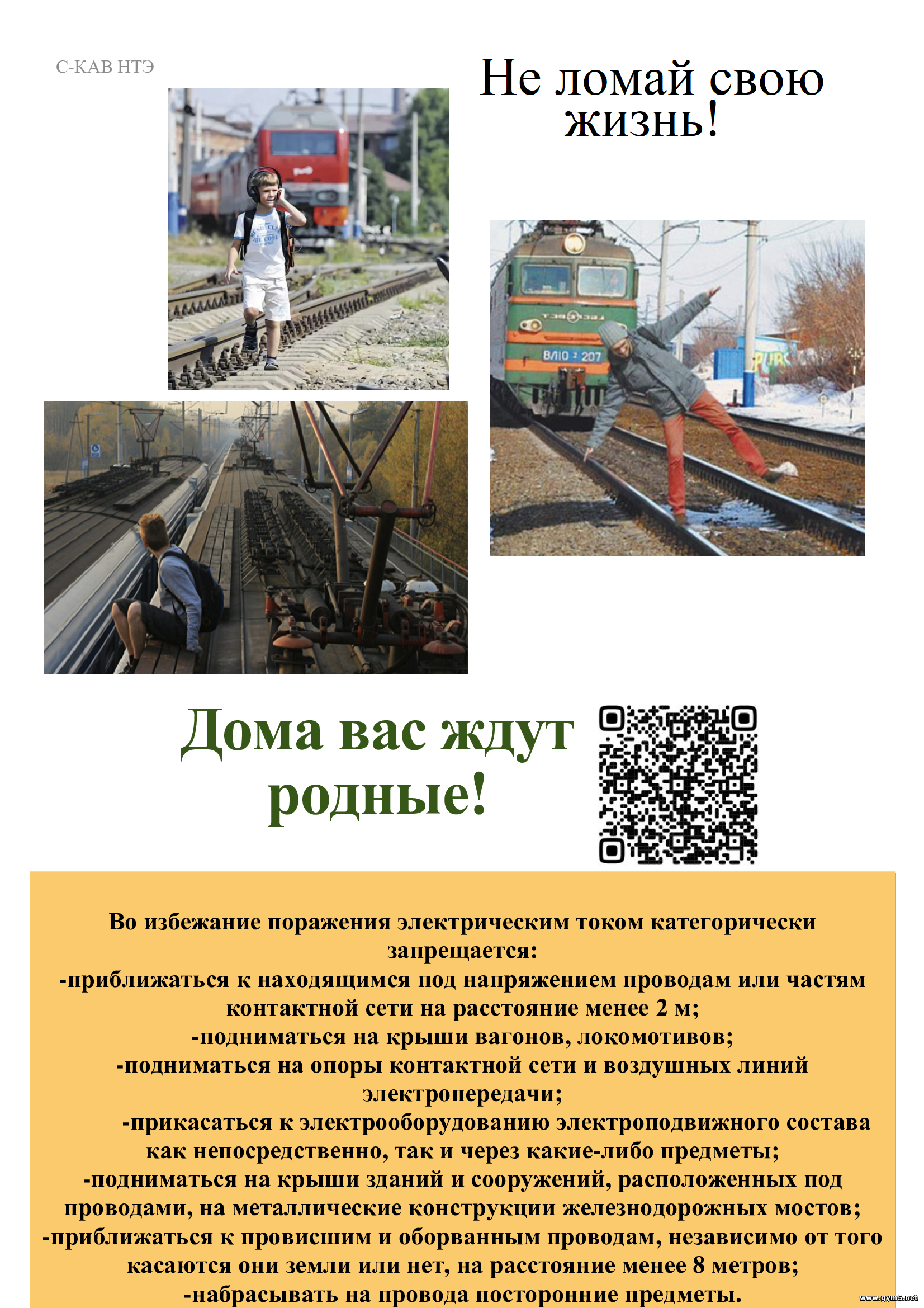 Во избежание поражения электрическим током в зоне железнодорожной инфраструктуры категорически запрещается: -приближаться к находящимся под напряжением проводам или частям контактной сети на расстояние менее 2 м; -подниматься на крыши вагонов, локомотивов; -подниматься на опоры контактной сети и воздушных линий электропередачи; -прикасаться к электрооборудованию электроподвижного состава как непосредственно, так и через какие-либо предметы; -подниматься на крыши зданий и сооружений, расположенных под проводами, на металлические конструкции железнодорожных мостов; -приближаться к провисшим и оборванным проводам, независимо от того касаются они земли или нет, на расстояние менее 8 метров (если же ты попал в опасную зону, то выходить из нее необходимо «гусиными» шагами, не отрывая ноги от земли, далее, при возможности, оградить место обрыва/ провисания провода и позвонить родителям или в службу 112); -набрасывать на провода посторонние предметы | |