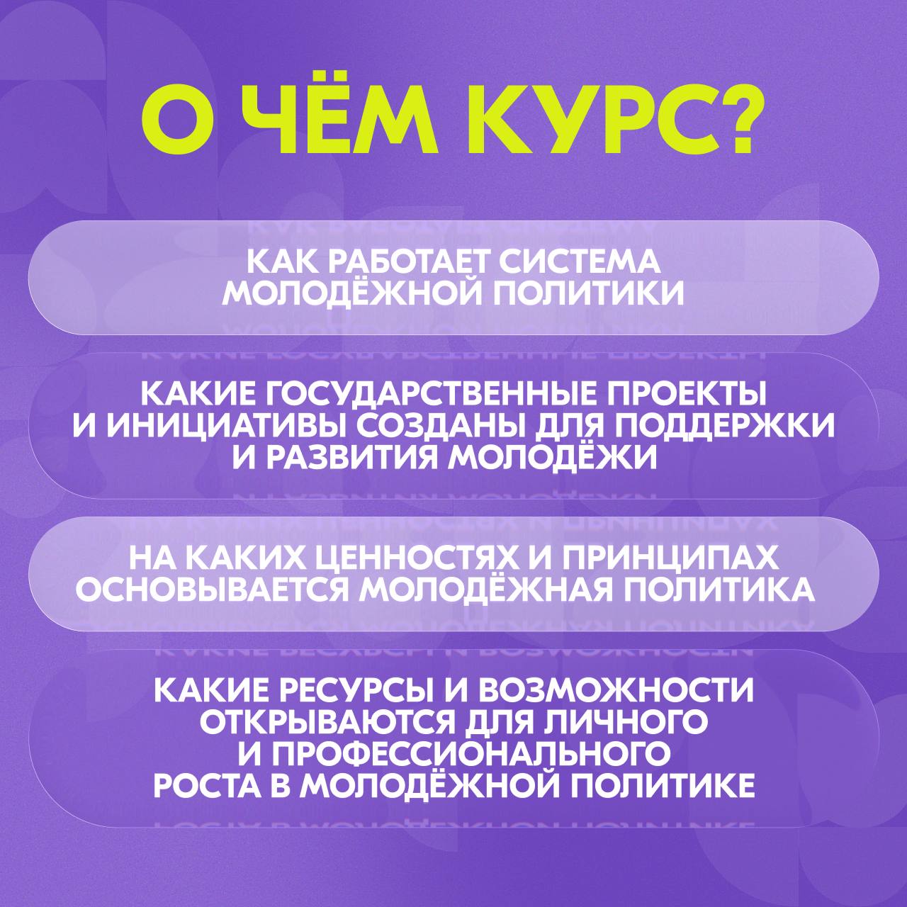 В курсе - 21 урок, в которых раскрываются основные направления молодёжной политики в нашей стране. Лекторы - первые лица профильных ведомств и организаций России.