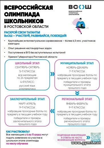Всероссийская олимпиада школьников является самым массовым интеллектуальным состязанием в Российской Федерации, проводимым в целях выявления и развития у обучающихся творческих способностей и интереса к научной (научно-исследовательской) деятельности, пропаганды научных знаний, отбора лиц, проявивших выдающиеся способности, в составы сборных команд Российской Федерации для участия в международных олимпиадах по общеобразовательным предметам. Ежегодно в олимпиаде участвуют более 6,5 миллионов талантливых детей. Диплом победителя и призёра заключительного этапа всероссийской олимпиады школьников считается престижной наградой, которая даёт право школьнику поступить в государственные вузы Российской Федерации без вступительных испытаний по профилю олимпиады. Право на льготу сохраняется в течение четырех лет. В прошлом учебном году в муниципальном этапе ВсОШ победителями и призёрам стали Хомутова Полина (физкультура и ОБЗР), Житников Михаил (ОБЗР), Марченко Анна (география). Всероссийская олимпиада школьников (ВсОШ) — шанс проверить силы, прокачать мозг и открыть себе дорогу в лучшие вузы страны. Методические рекомендации к проведению ШЭ ВсОШ и МЭ ВсОШ по каждому общеобразовательному предмету размещены по адресу | |