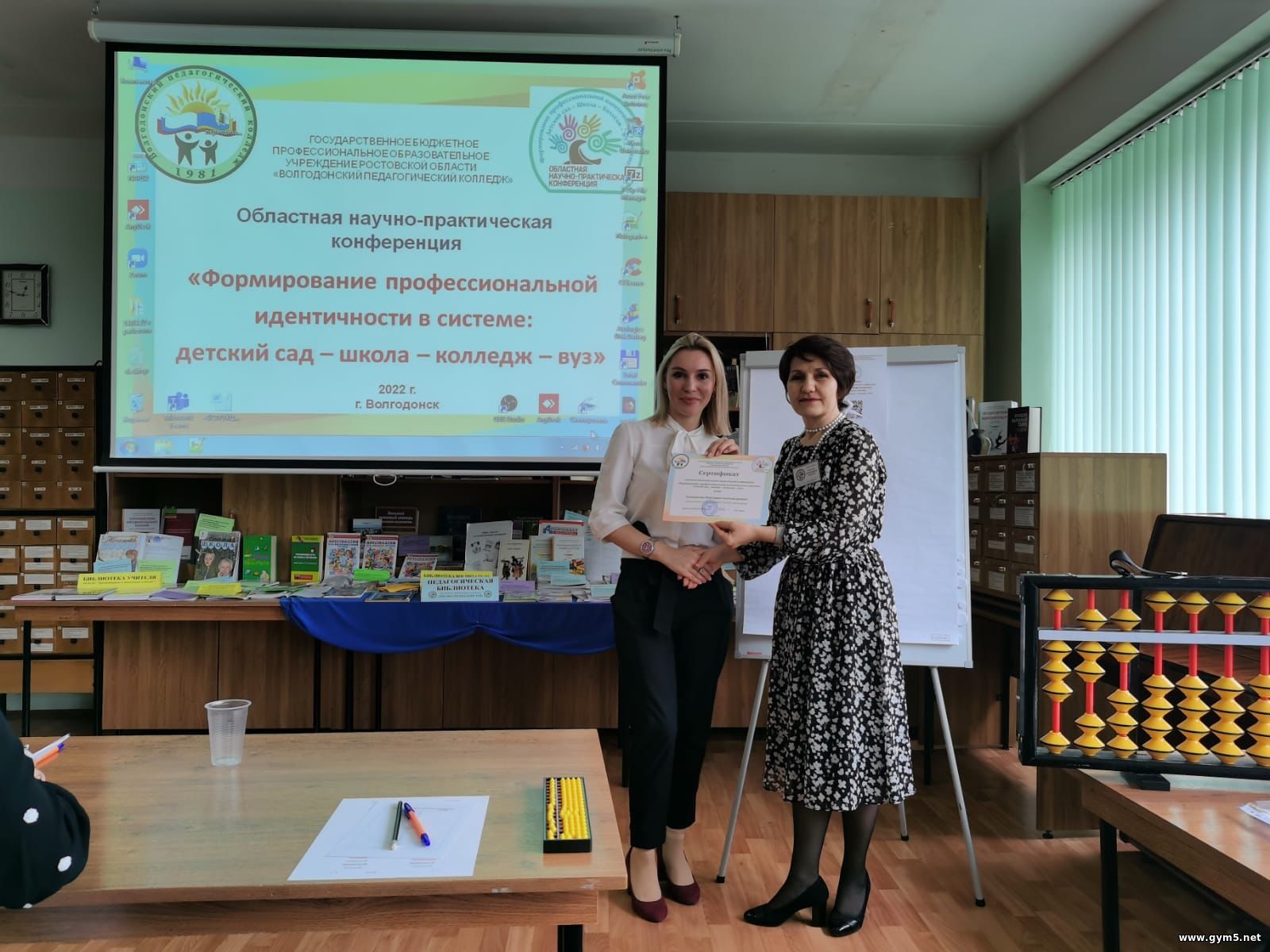 14 апреля 2022 года Тимохина Е.Н., директор МБОУ СШ №5 г.Волгодонска приняла участие в областной открытой научно-практической конференции «Формирование профессиональной идентичности в системе: детский сад – школа – колледж – вуз», которая проходила на базе ГБПОУ РО «Волгодонский педагогический колледж».
