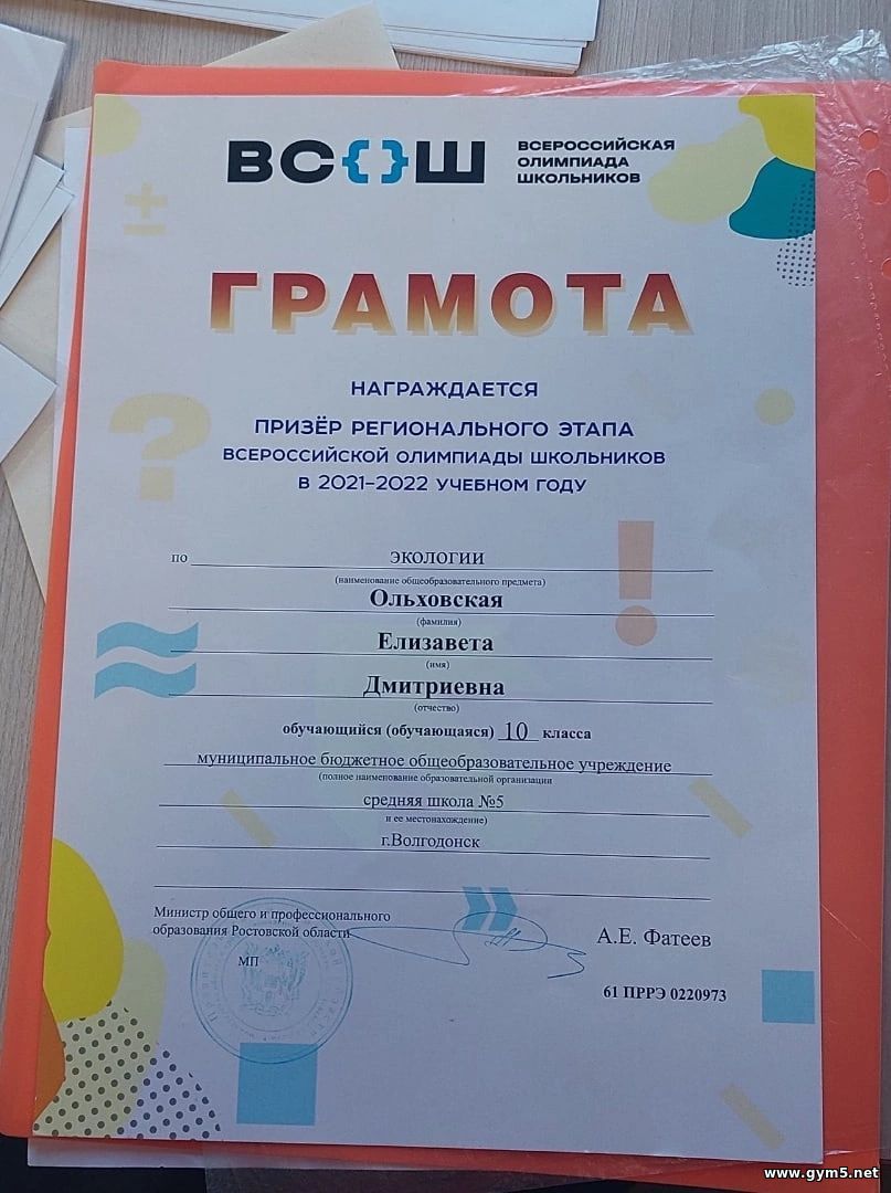 стала призером регионального этапа Всероссийской Олимпиады школьников по экологии 2021-2022
