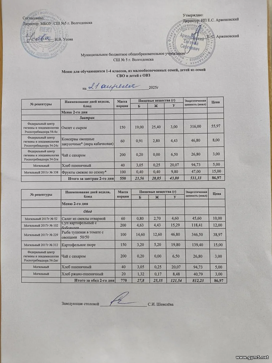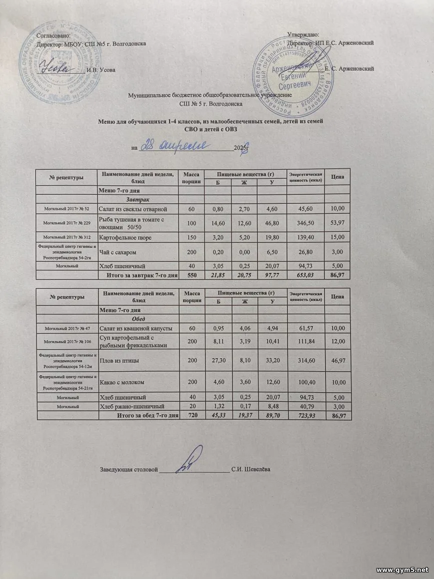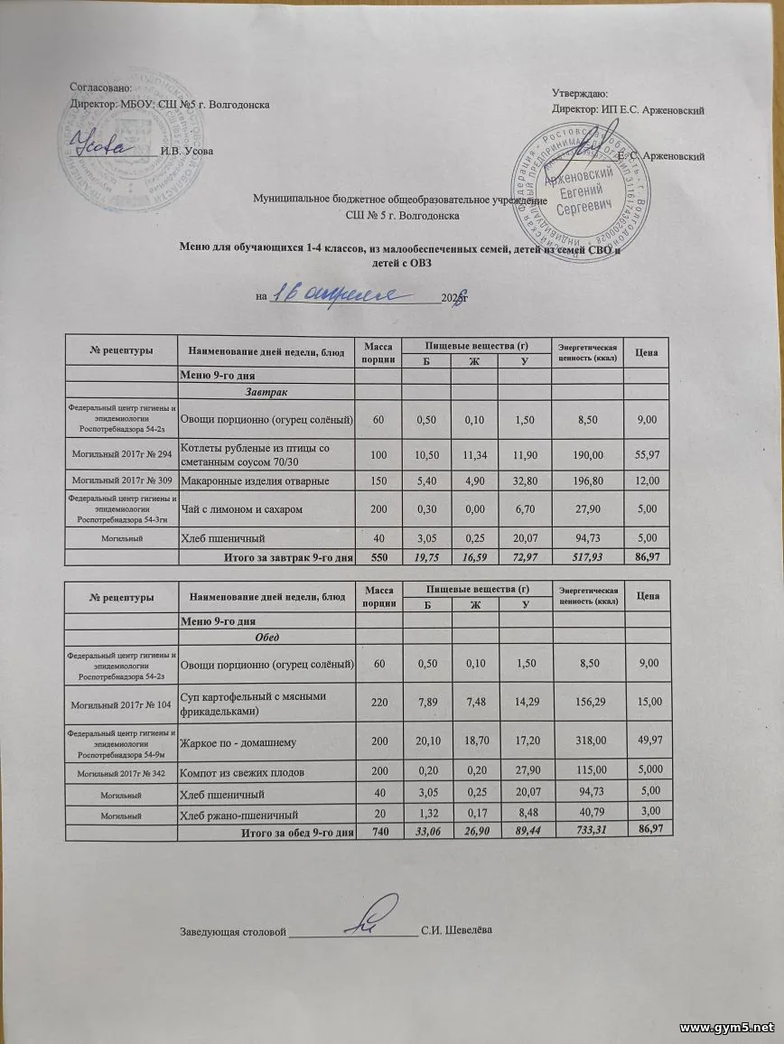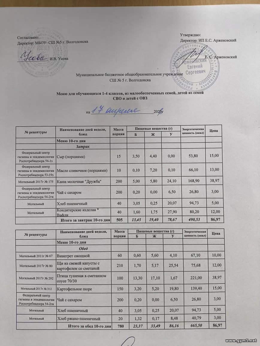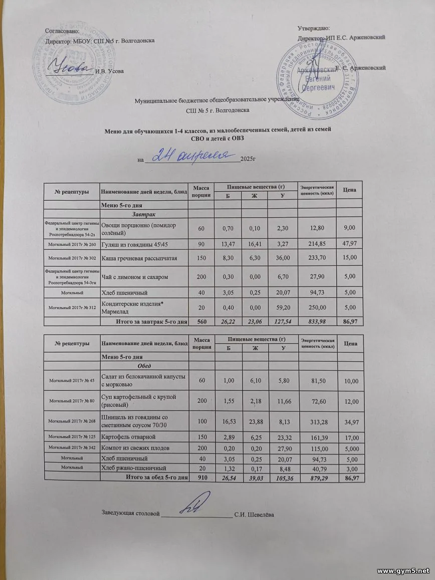 Организатором питания в МБОУ СШ №5 г.Волгодонска является ИП Арженовский Е.С.