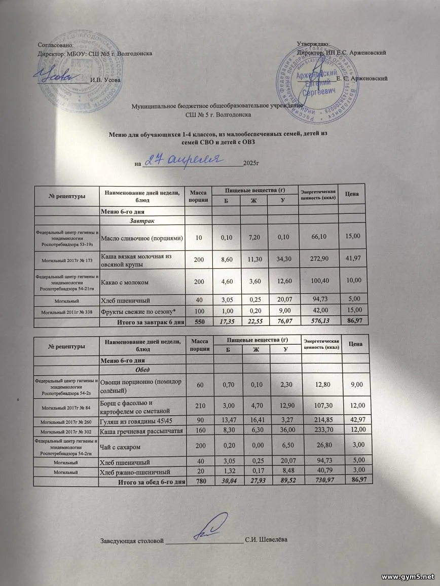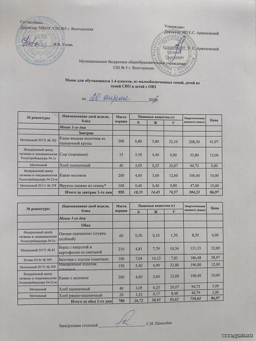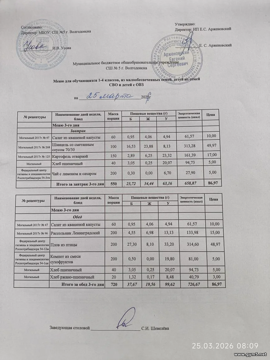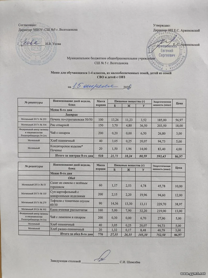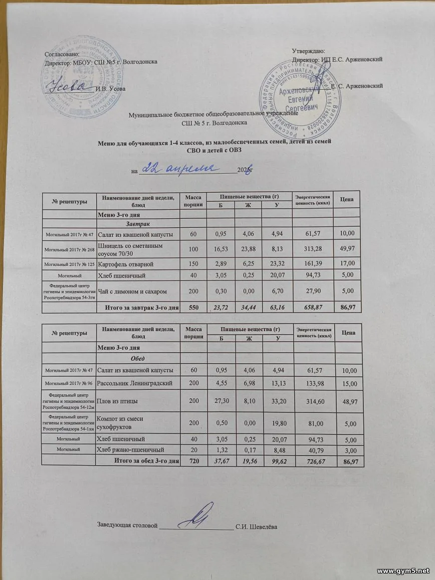 Организатором питания в МБОУ СШ №5 г.Волгодонска является ИП Арженовский Е.С.