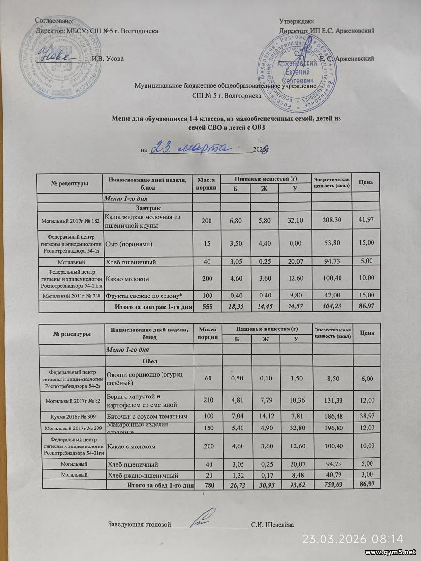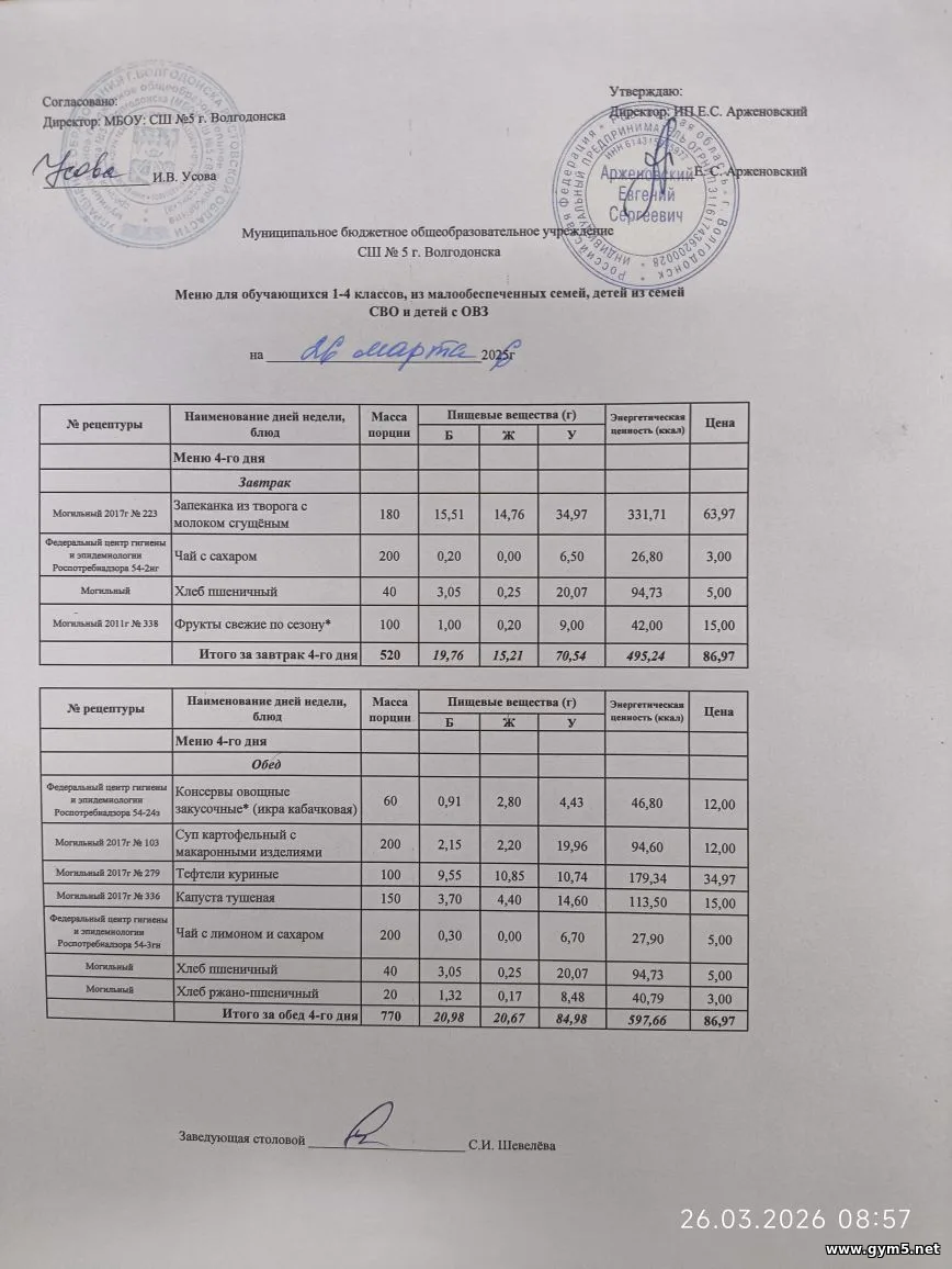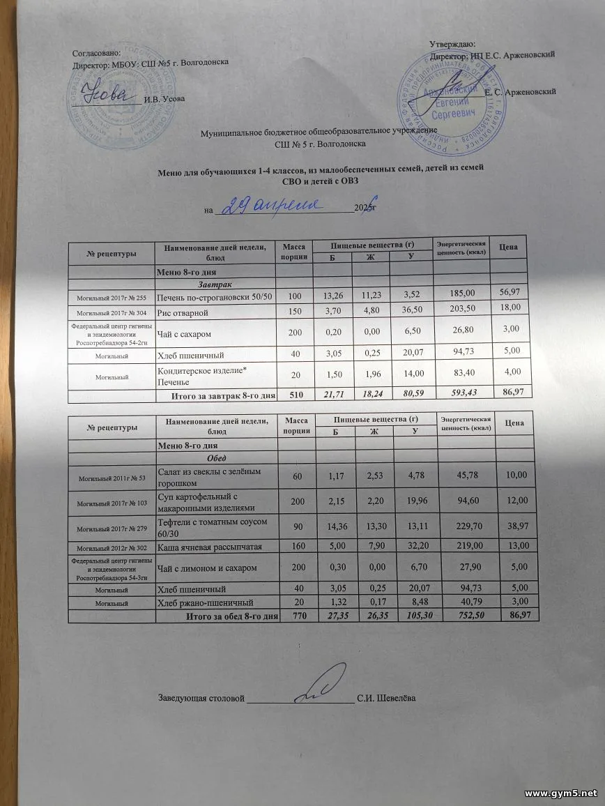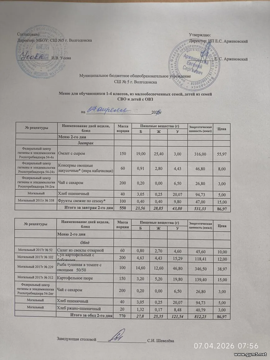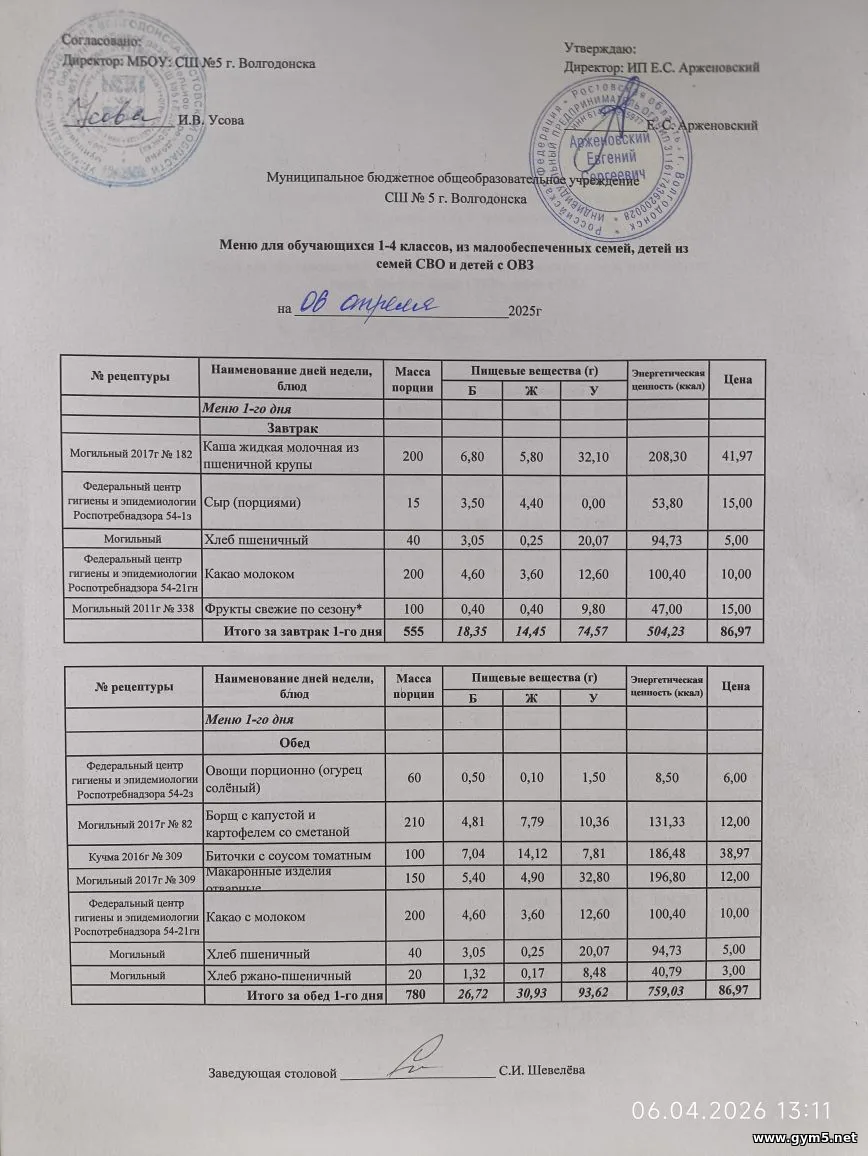 Организатором питания в МБОУ СШ №5 г.Волгодонска является ИП Арженовский Е.С.