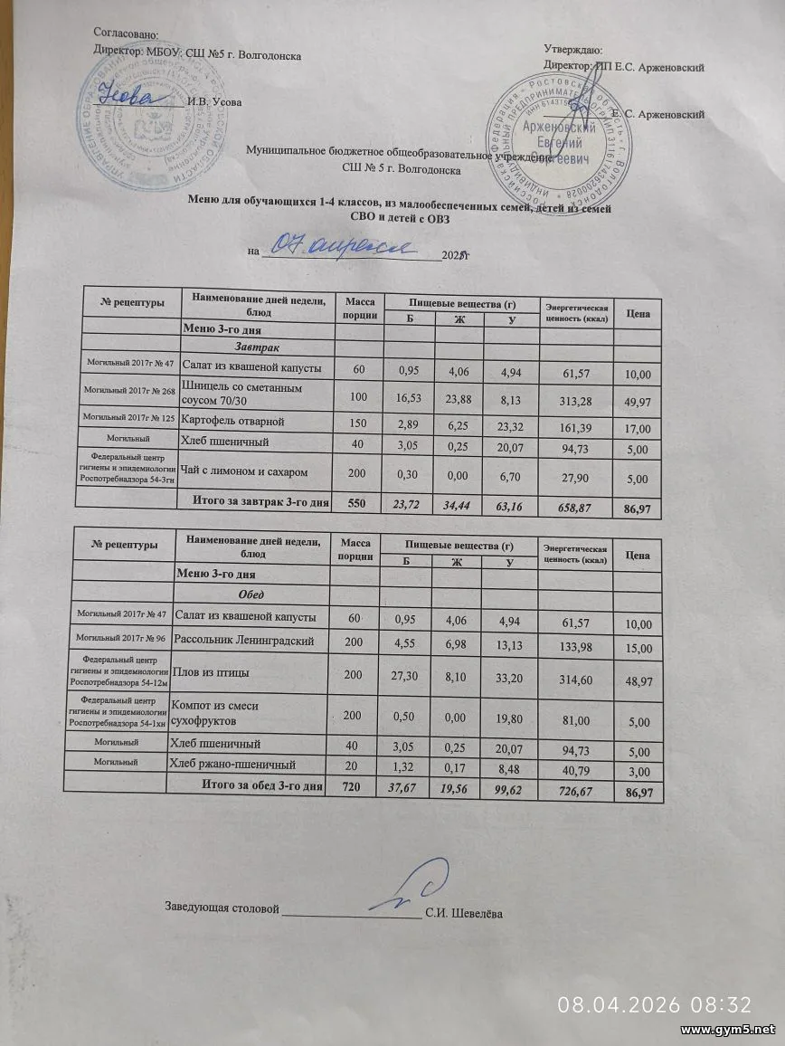 20.11.2025 в МБОУ СШ №5 г.Волгодонска прошел родительский контроль по проверке качества и безопасности питания по соблюдению СанПиН